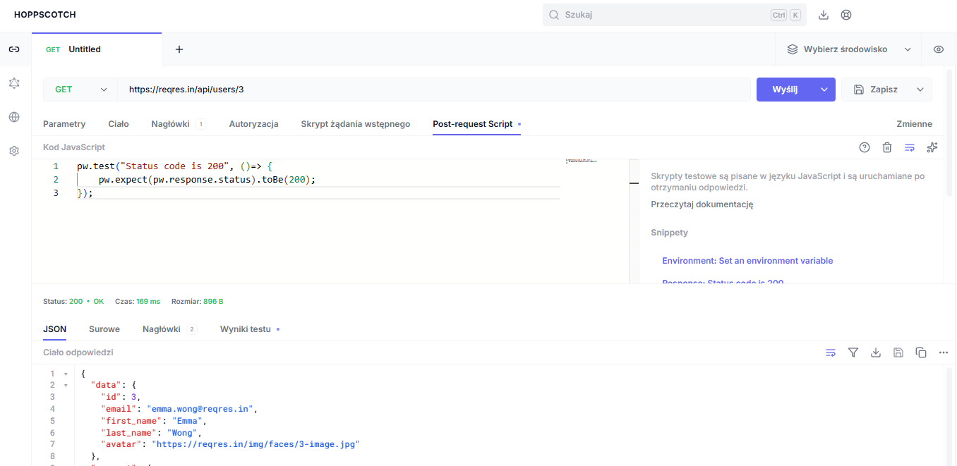 Podobnie jak w Postmanie, Bruno, czy Insomni – można pisać swoje testy. Narzędzie posiada też snippety z których można skorzystać i łatwo weryfikować jak działa nasze API – weryfikują automatycznie odpowiedzi. Zarówno jak w innych narzędziach możemy korzystać i tworzyć środowiska – by uniwersalizować testy. Ponadto można testy uruchamiać w trybie consolowym, by używać ich na środowiskach CI/CD.
