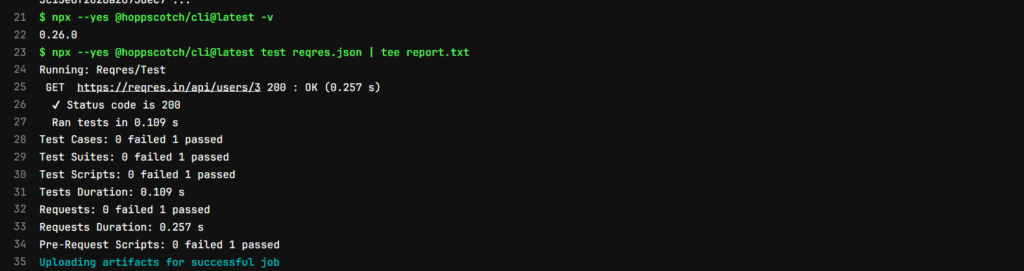 - npx --yes @hoppscotch/cli@latest test test.json | tee report.txt